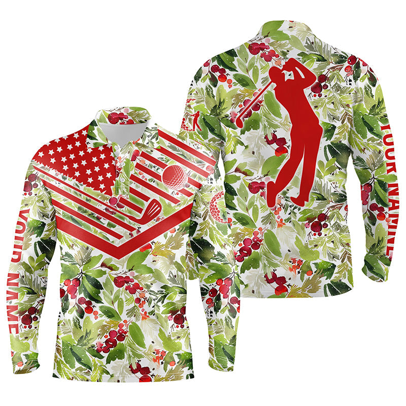Mens golf polo shirt Christmas pattern American flag custom name golf shirt NQS4185