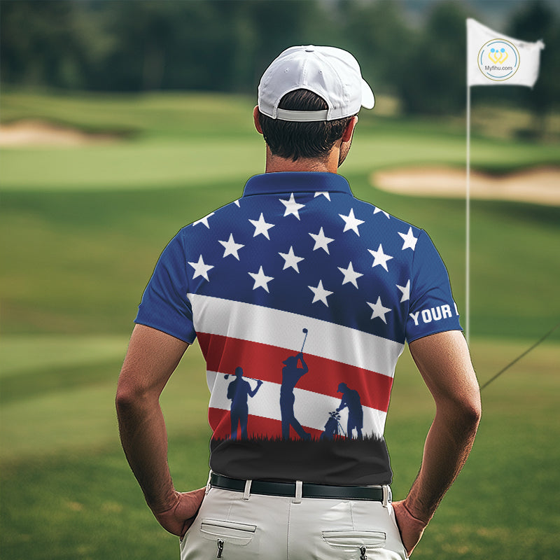 American Flag golf polo shirts for men Custom Red, White and Blue Patriotic mens golf attire NQS10230