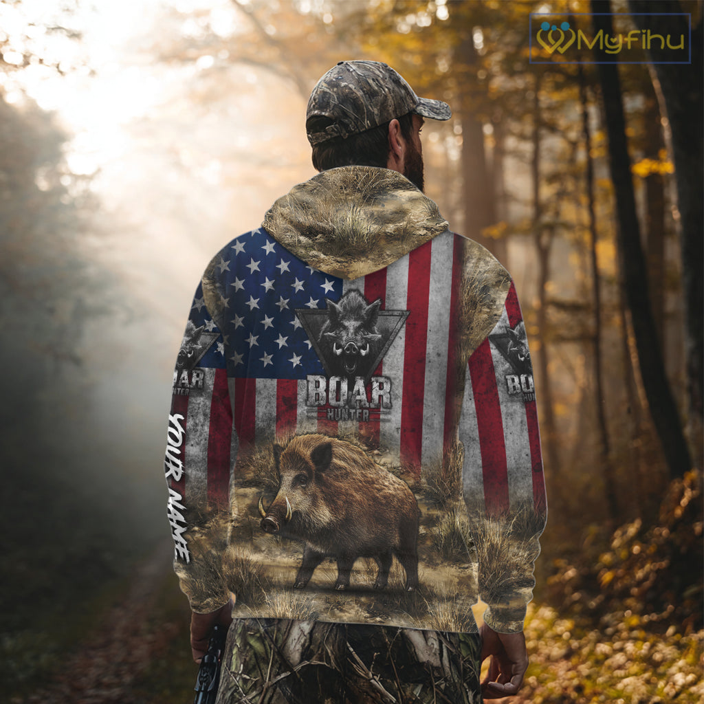 American Flag Wild Boar Camo Custom Name 3D Shirts, Boar Hunting Clothes for Hunters NBT132