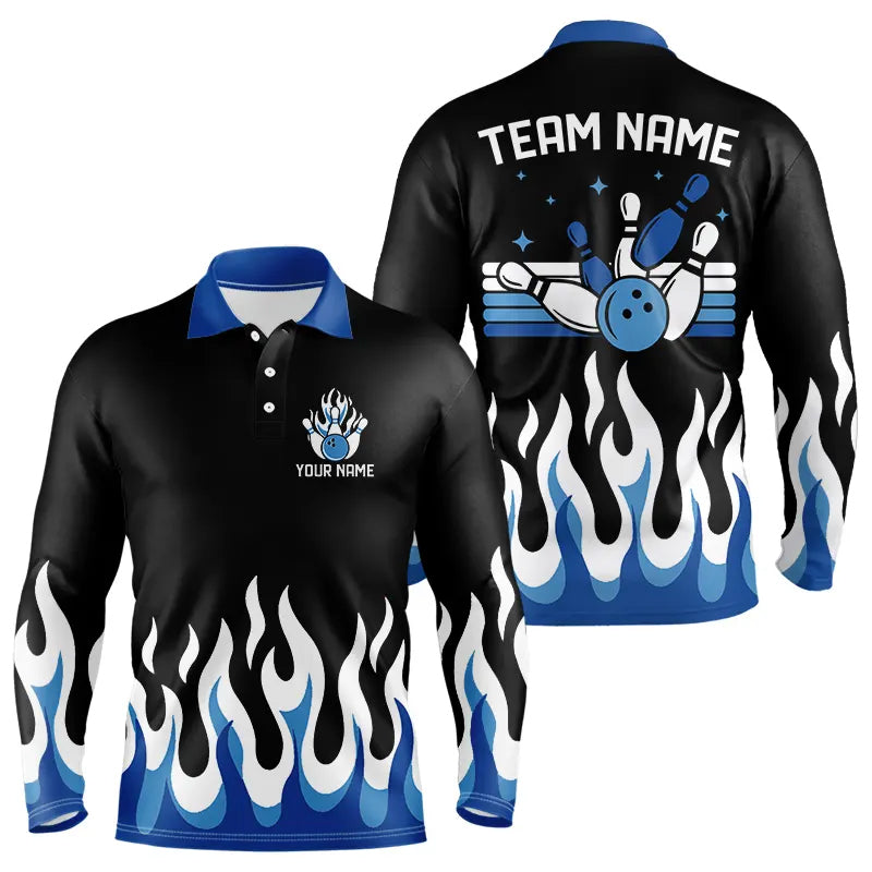 Black and Blue Flame Retro Bowling Polo, Quarter Zip Shirt for Men Custom Bowling Team Jerseys NQS9155