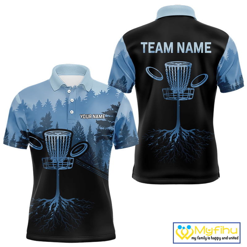 Black and Blue forest camo Mens Disc golf polo shirts Custom team disc golf wear, disc golf outfit NQS10065