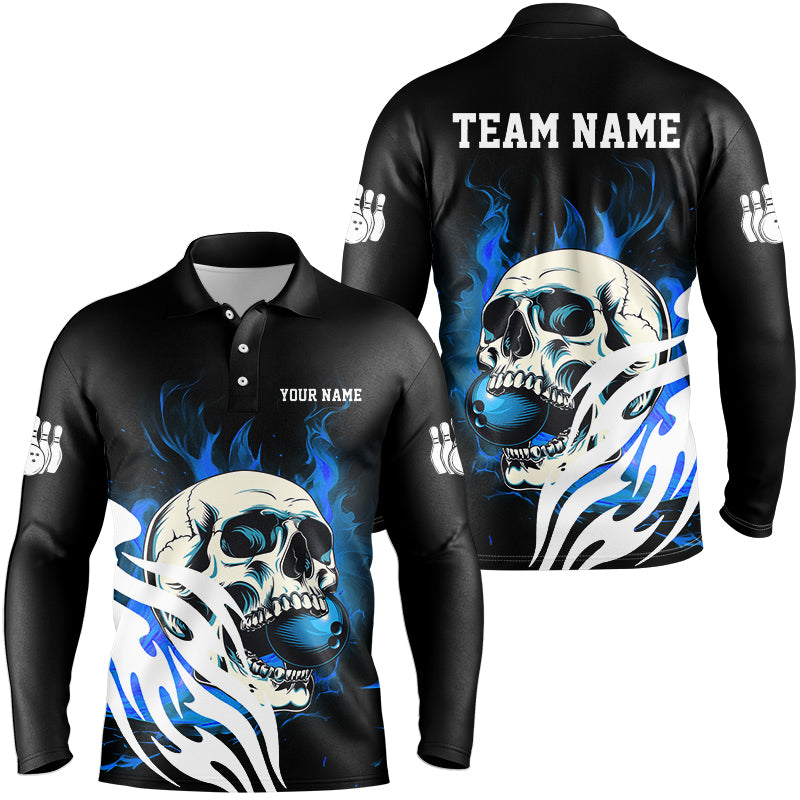 Black and Blue Skull Bowling Polo, Quarter Zip Shirts For Men Custom Bowling Team League Jersey NQS8781