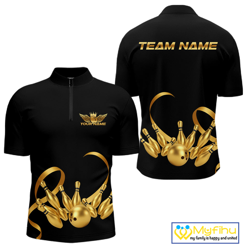 Black and Gold Ribbon Bowling Polo, 1/4 Zip Shirts For Men Custom Breast Cancer Bowling Team Shirt NQS10465