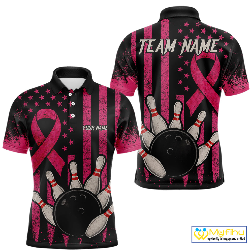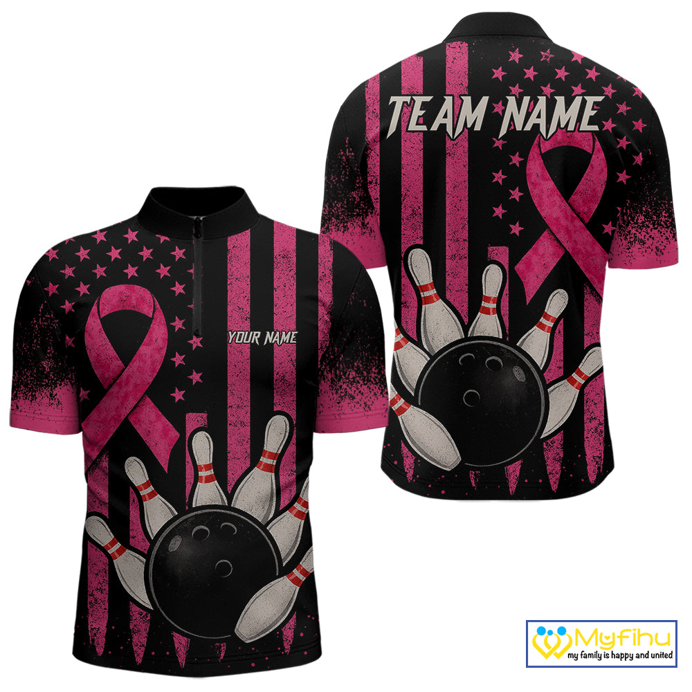 Black and Pink ribbon American Flag Breast Cancer Bowling Shirts For Men Custom Bowling Team Jerseys NQS9841