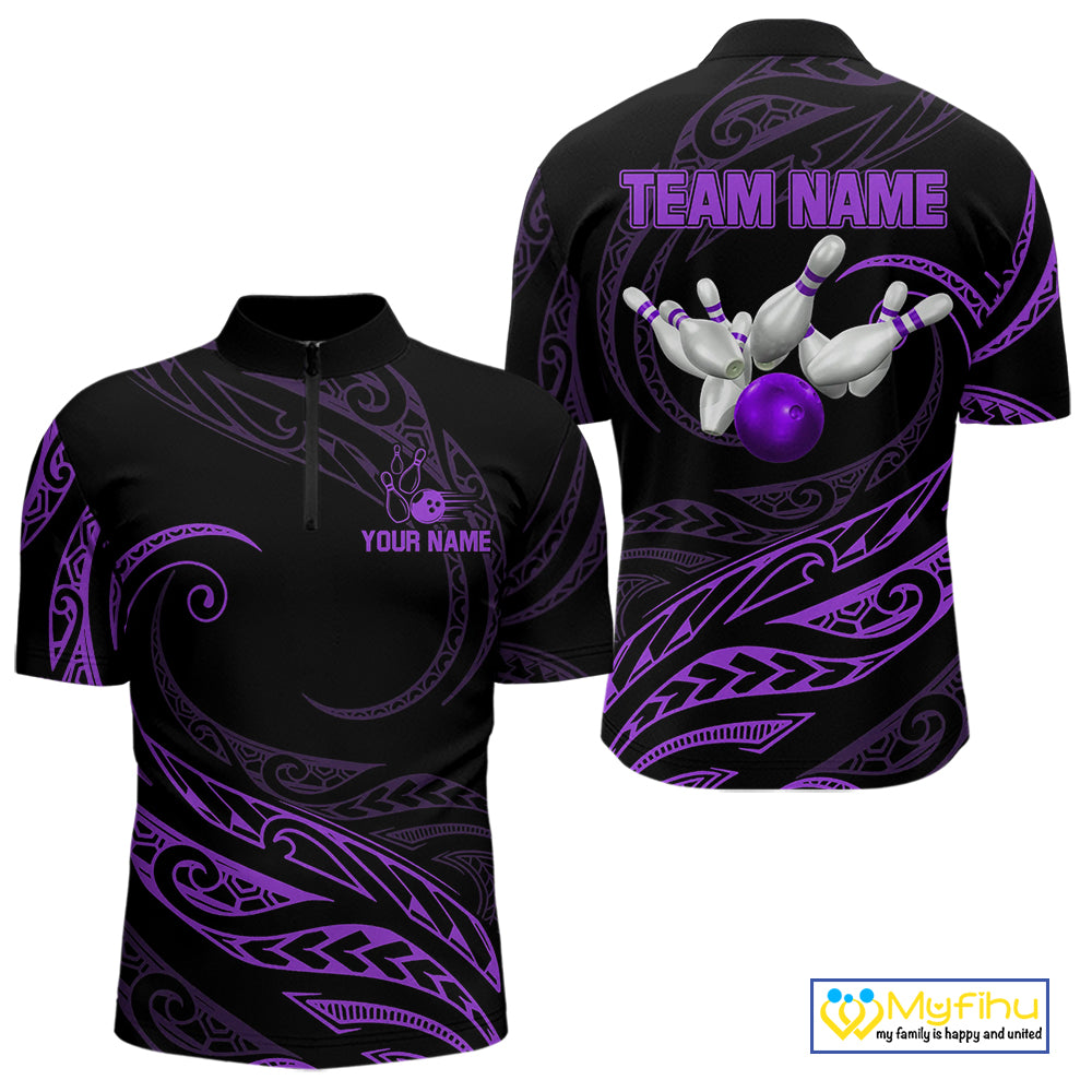 Black and Purple Tribal Pattern Bowling Polo, Quarter Zip shirts For Men Custom Team Bowling Jerseys NQS10486