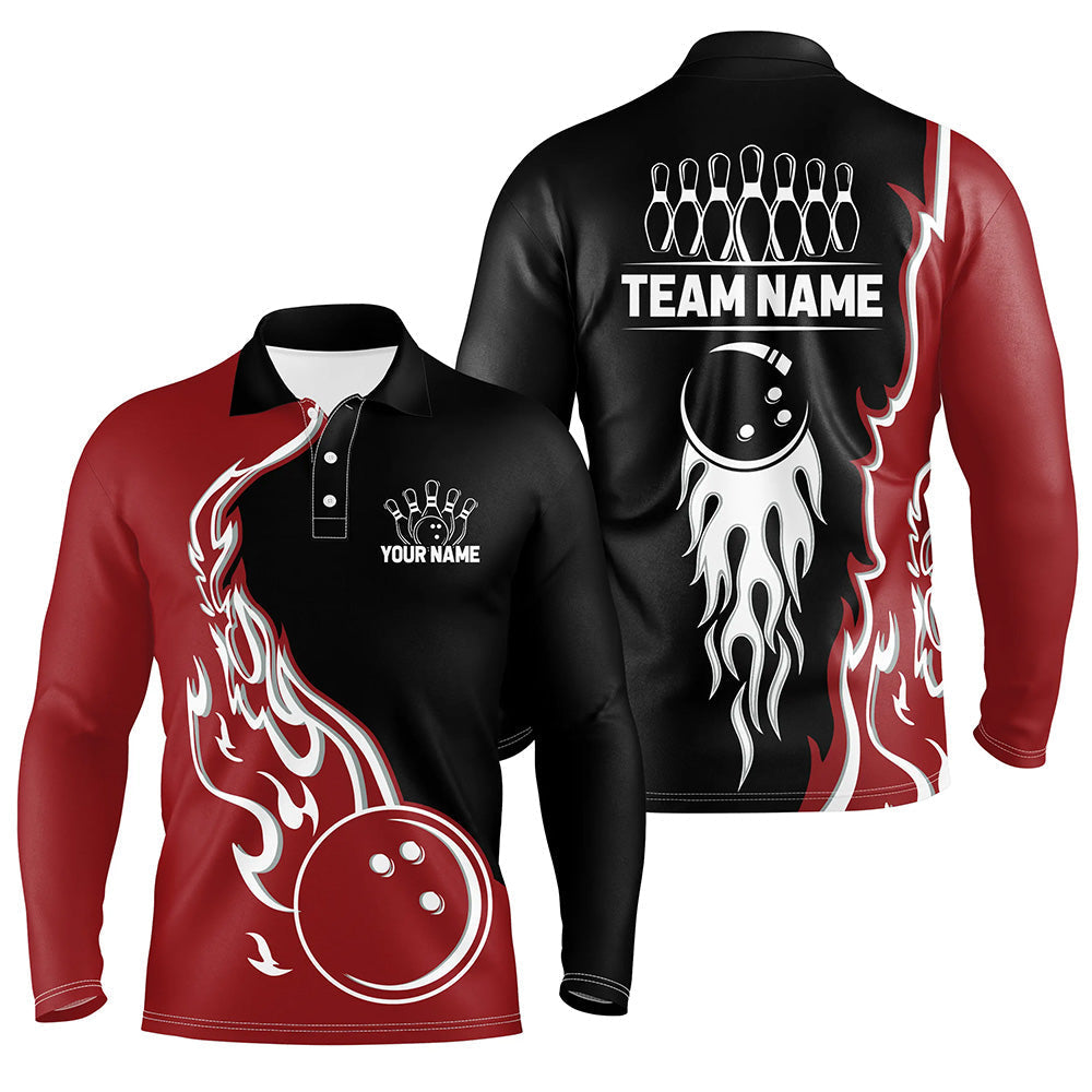 Black and Red Flame Bowling Polo, Quarter Zip Shirt for Men Custom Team Bowling Jersey Bowler Outfit NQS8865