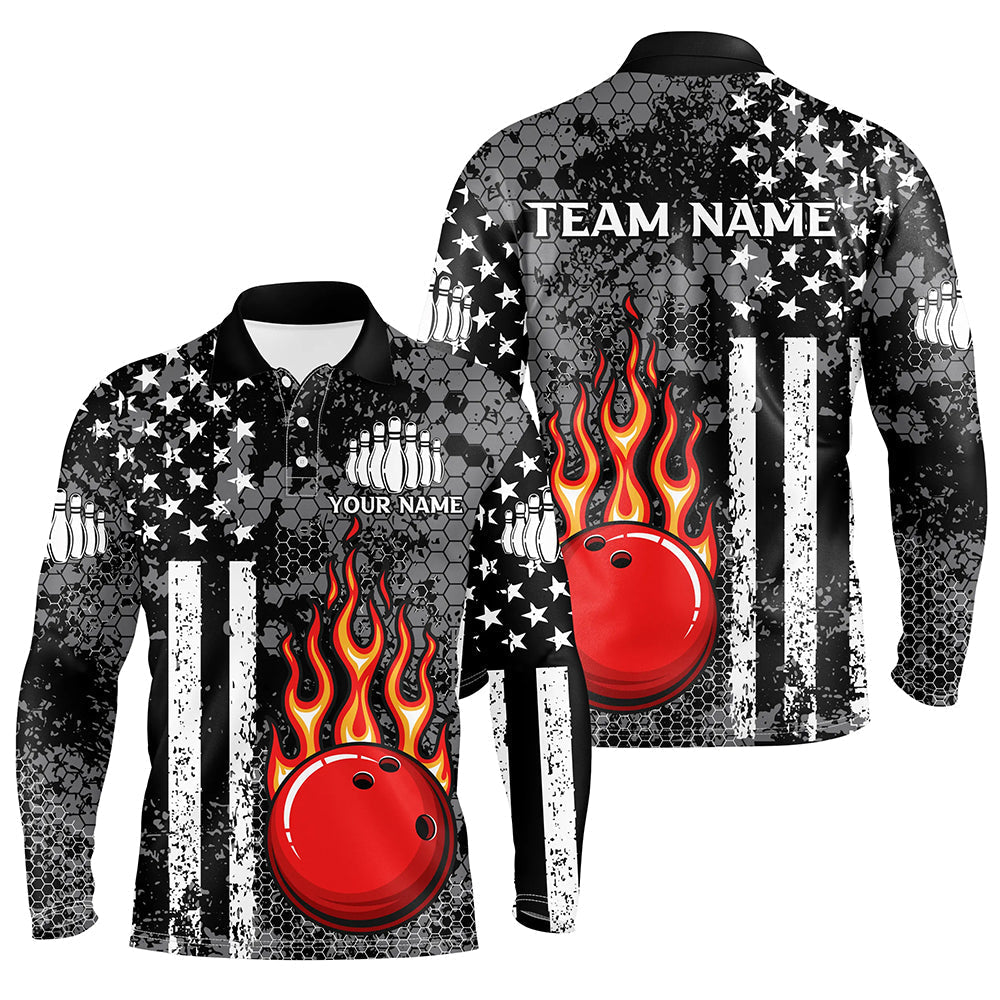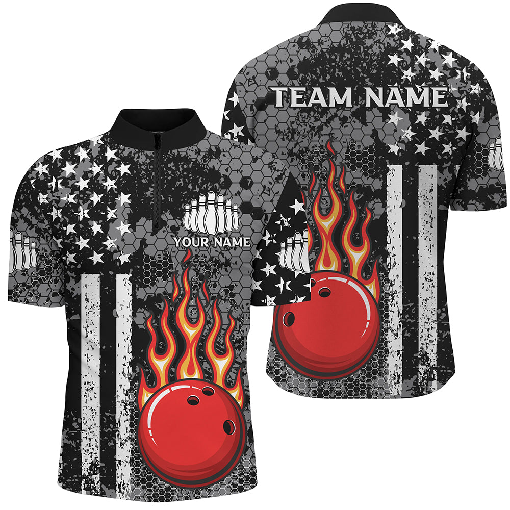 Black and White American Flag Flame Bowling Polo, Quarter Zip Shirt For Men Custom Bowling Team Jersey NQS9108