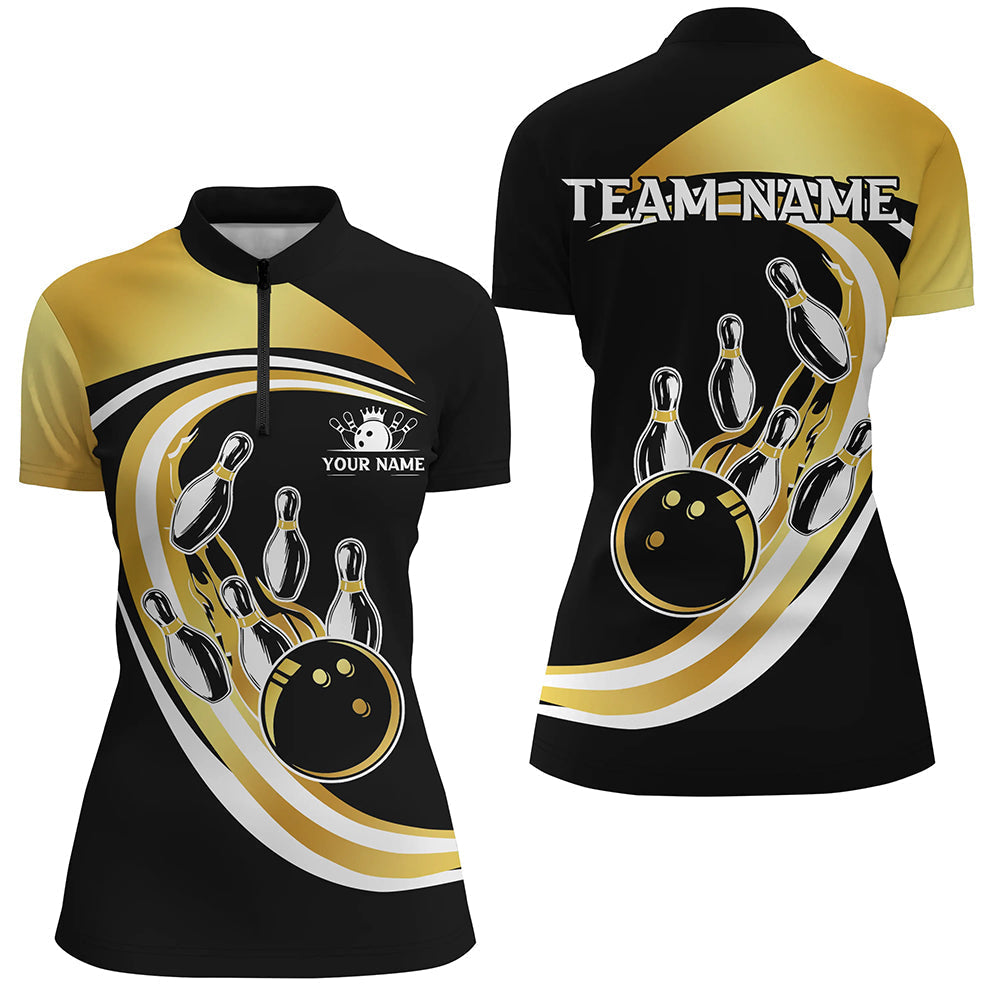 Black & Gold Bowling Polo, 1/4 Zip Shirts For Women Custom Bowling Team League Jersey, Gift For Bowler NQS8705