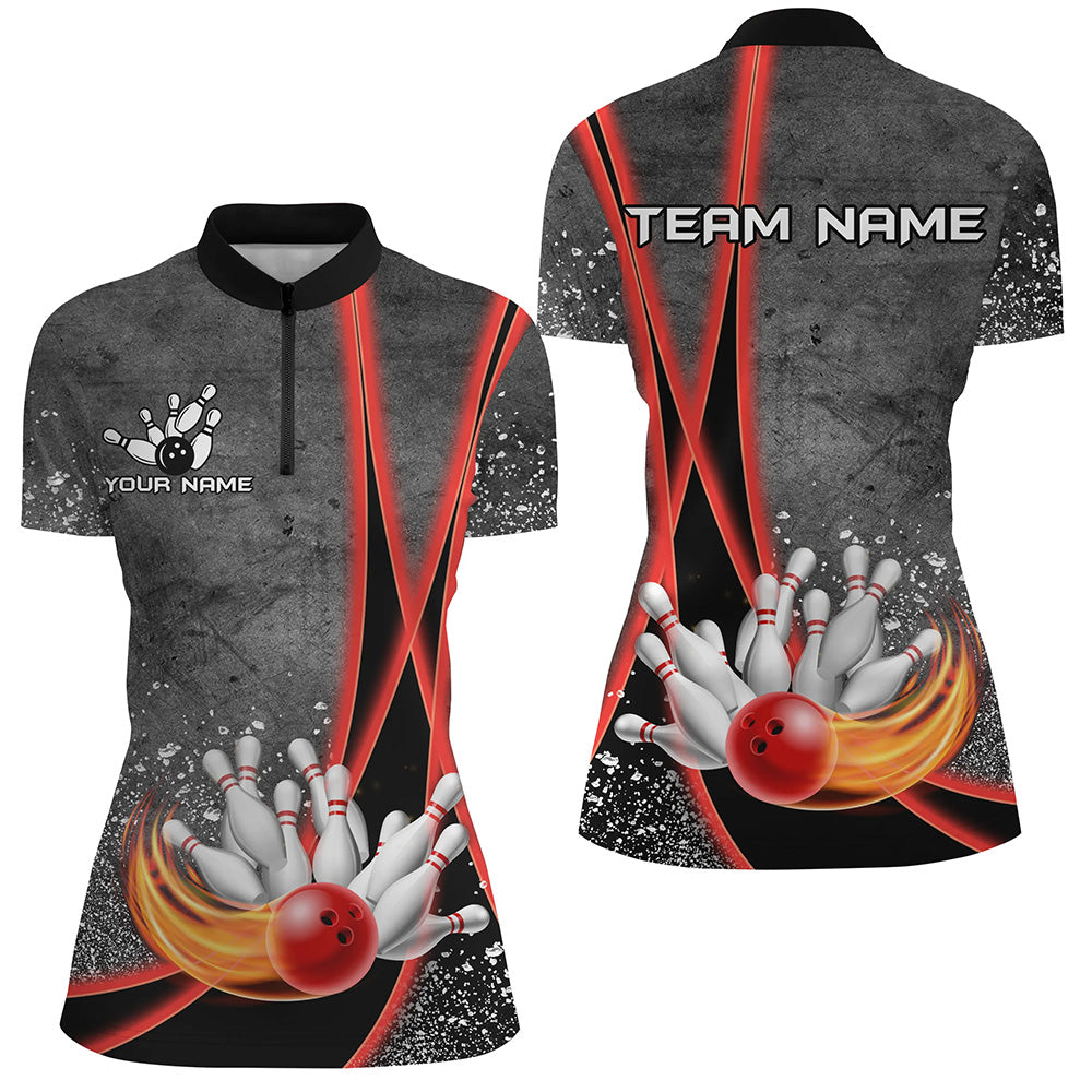 Black grunge Custom Flame Bowling Polo, 1/4 Zip Shirt For Women, Personalized Bowling Team Jersey| Red NQS8898
