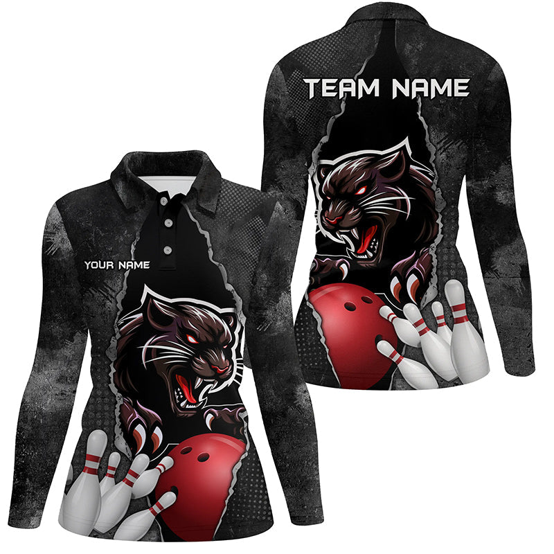 Black grunge pattern Custom Women Bowling Polo, Quarter Zip Shirt Panther Bowling Team Jerseys Outfits NQS8842