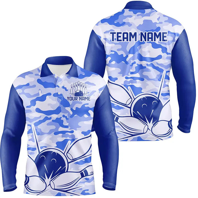 Blue Camo Bowling Polo, 1/4 Zip Shirts For Men Custom Bowling Team League Jerseys, Gift For Bowlers NQS8776