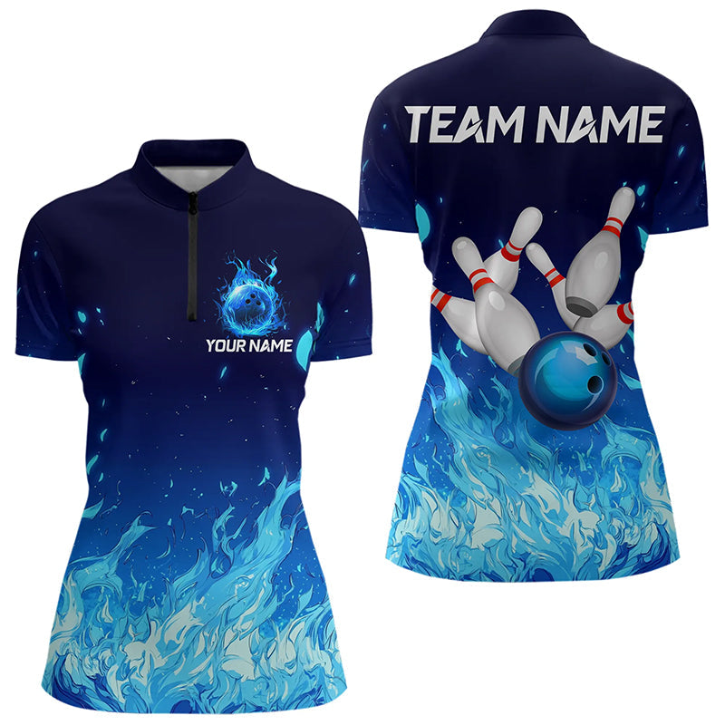 Blue Flame Fire Bowling Polo, Quarter Zip Shirts for Women Custom Bowling Team jerseys, Bowling Outfit NQS9285