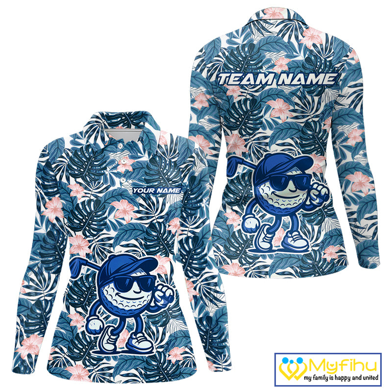 Blue tropical leaf pattern pink flower funny Golf polo shirts for Women Custom ladies golf outfits NQS10119