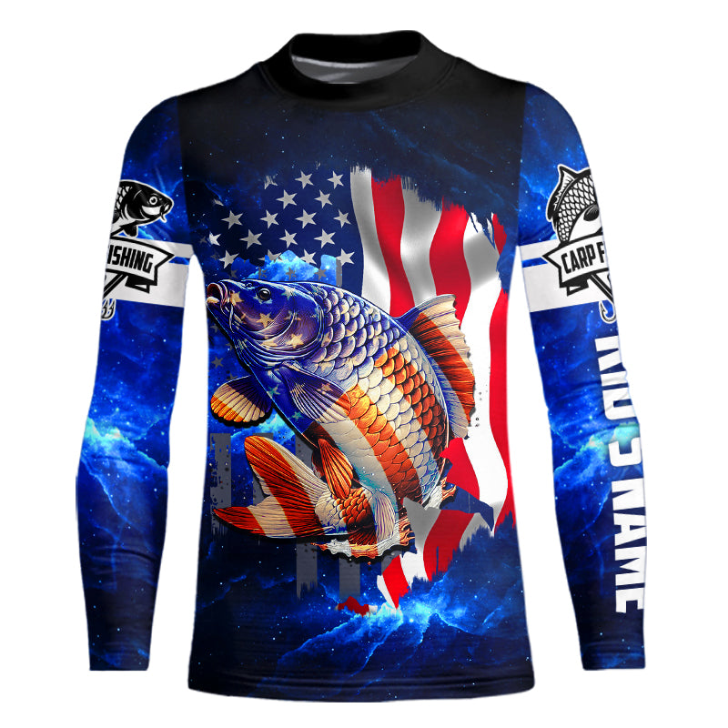 Carp Fishing blue galaxy 3D American Flag patriotic Customize name All over print fishing shirts NQS449
