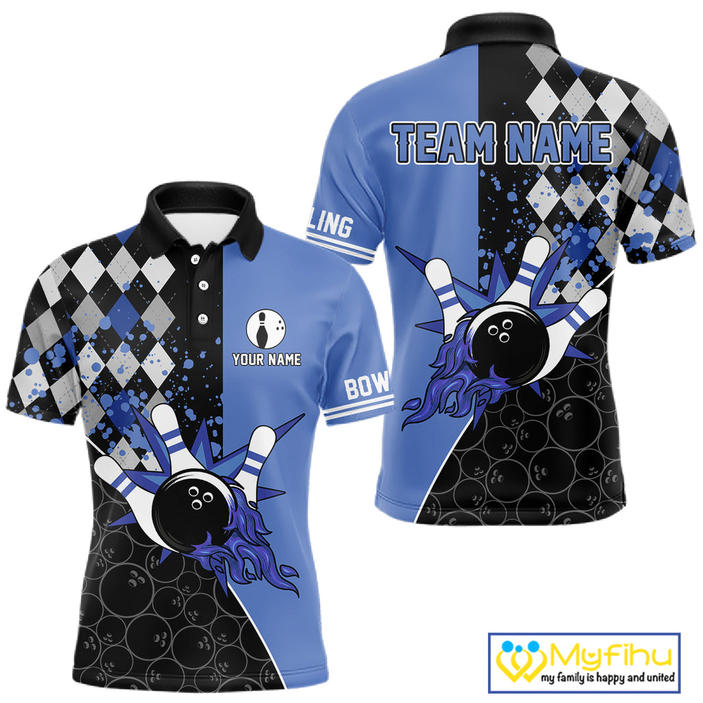 Custom Black and Blue argyle pattern flame Bowling Team Jerseys, Bowling Polo, 1/4 Zip Shirt for Men NQS10451