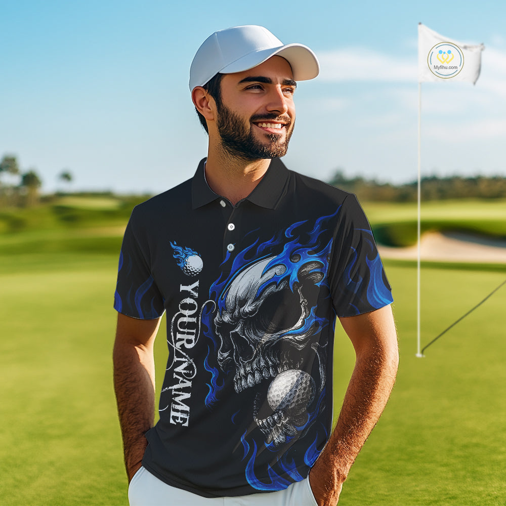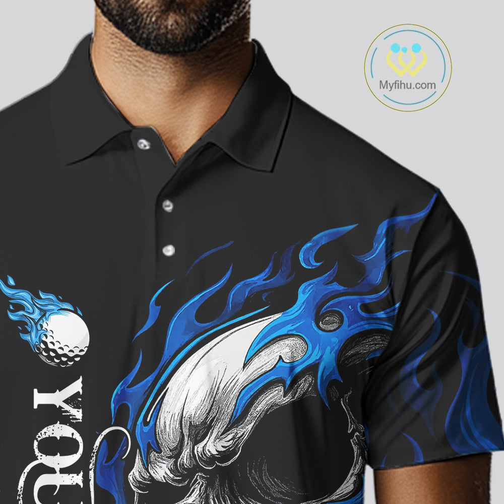 Custom Black and Blue Flame Skull Mens golf polo shirts, Personalized Skull Team Mens Golf Outfit NQS10576