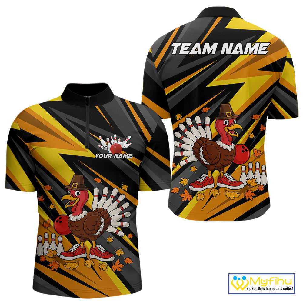Custom Funny Turkey Bowling Shirts For Men, Black and Yellow Camo Thanksgiving Bowling Shirt Team NQS10683