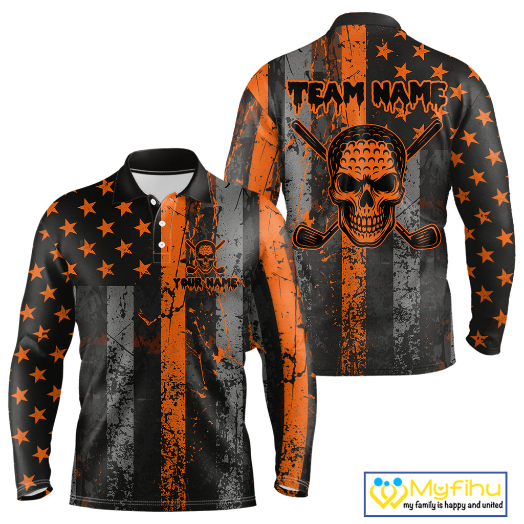 Custom Orange Grunge American Flag Patriotic Skull Halloween Golf Shirt For Men, Retro Mens Golf top NQS10483