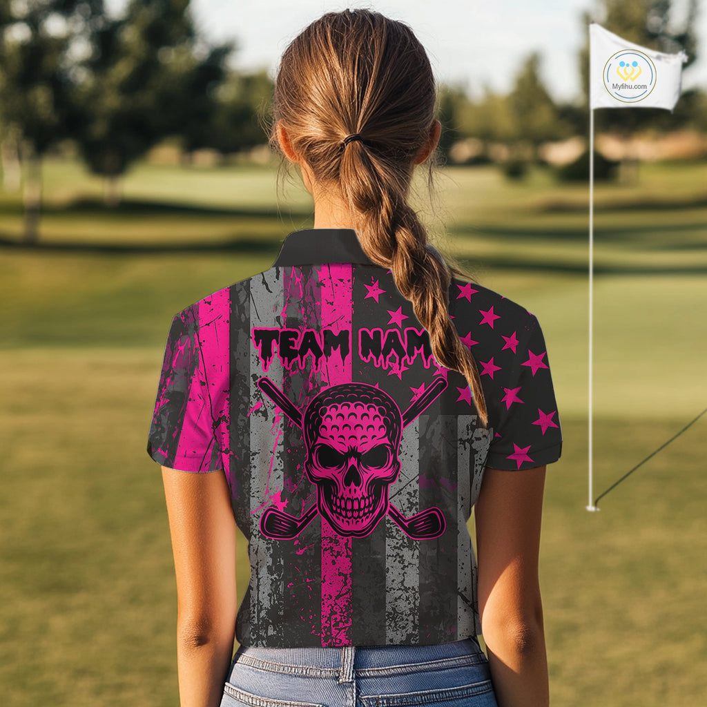Custom Pink Grunge American Flag Patriotic Skull Golf Shirt For Women, Retro Ladies Golf top NQS10482