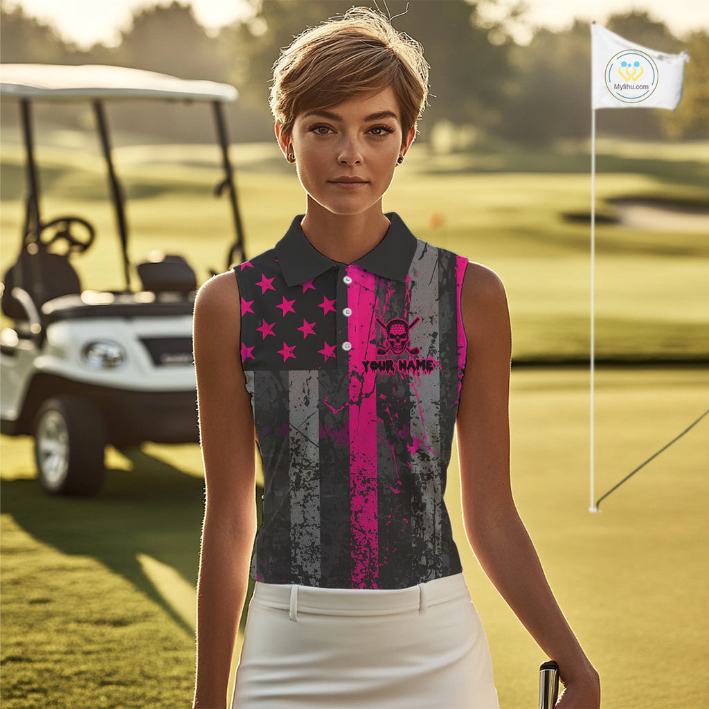 Custom Pink Grunge American Flag Patriotic Skull Sleeveless Golf Polo Shirt, Retro Golf top NQS10482