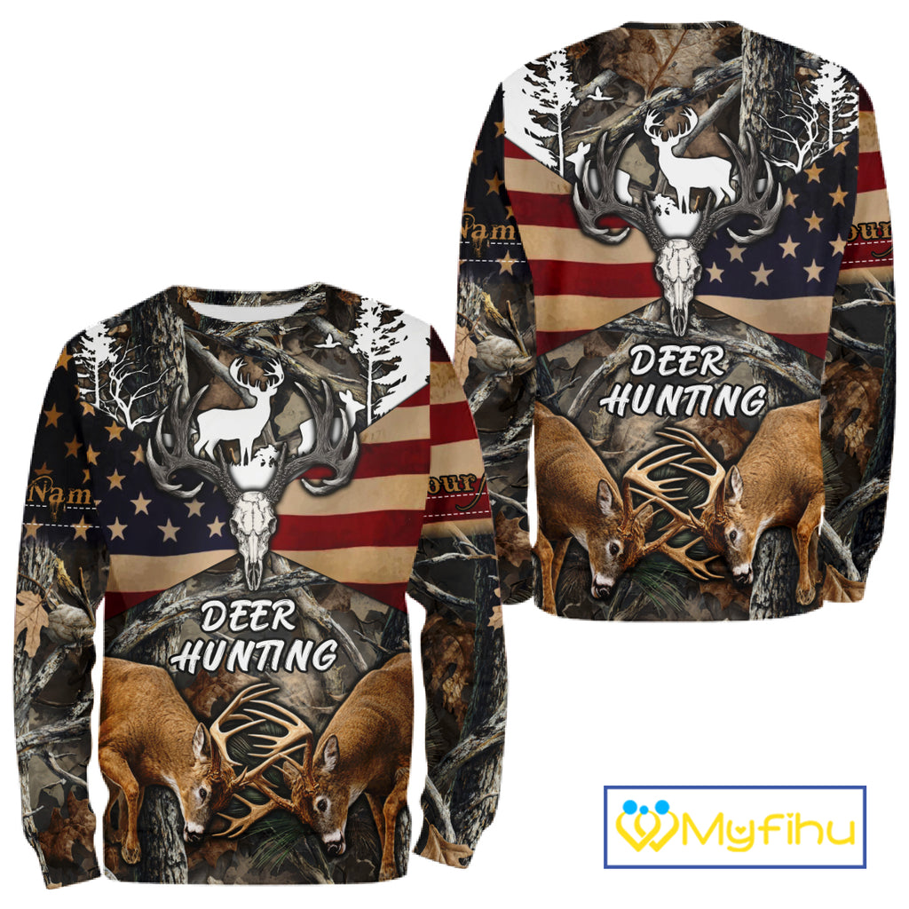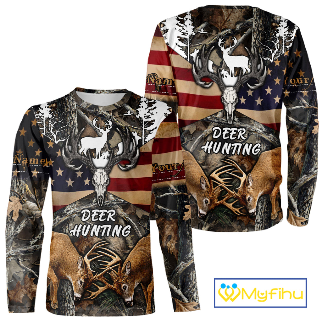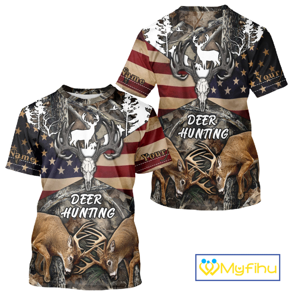Custom Whitetail Deer Hunting Forest Camo Shirts with US Flag, Personalized Hunting Shirt NBT341