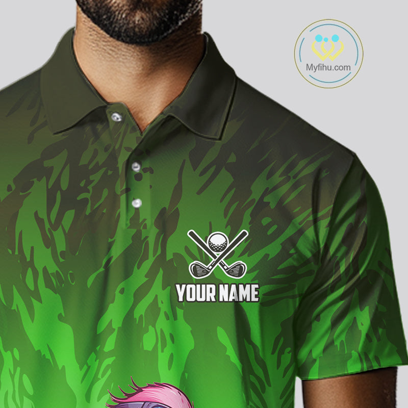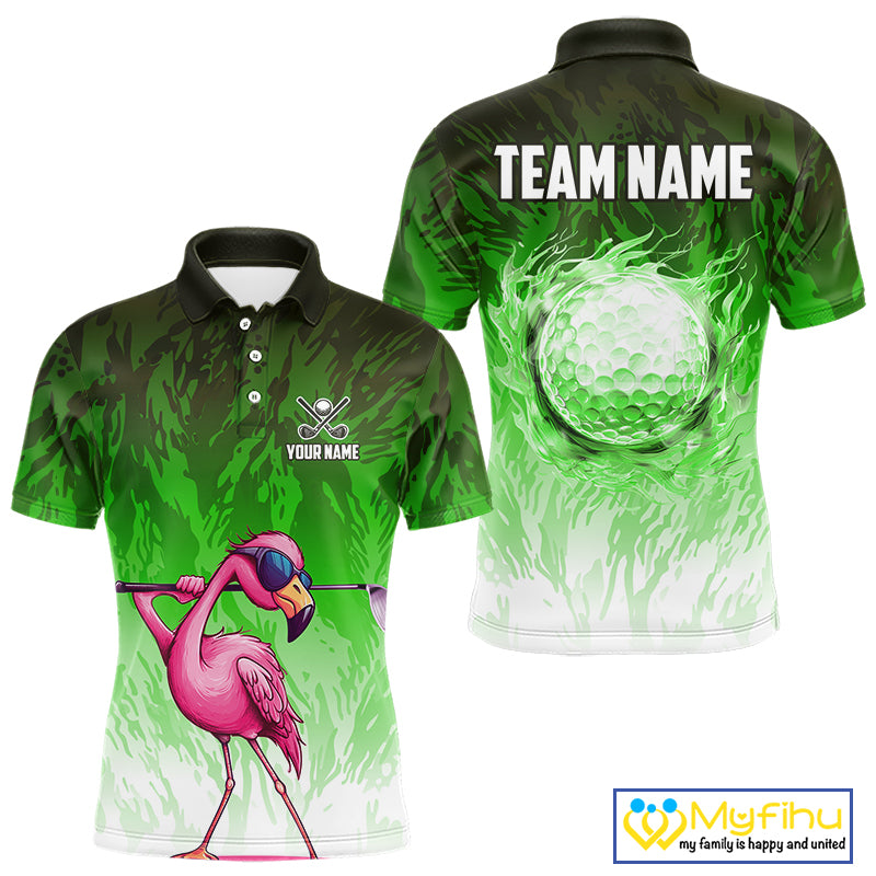 Funny Flamingo Green camo flame golf ball Mens Golf Polo Shirts Custom Flamingo Golf attire for men NQS9799