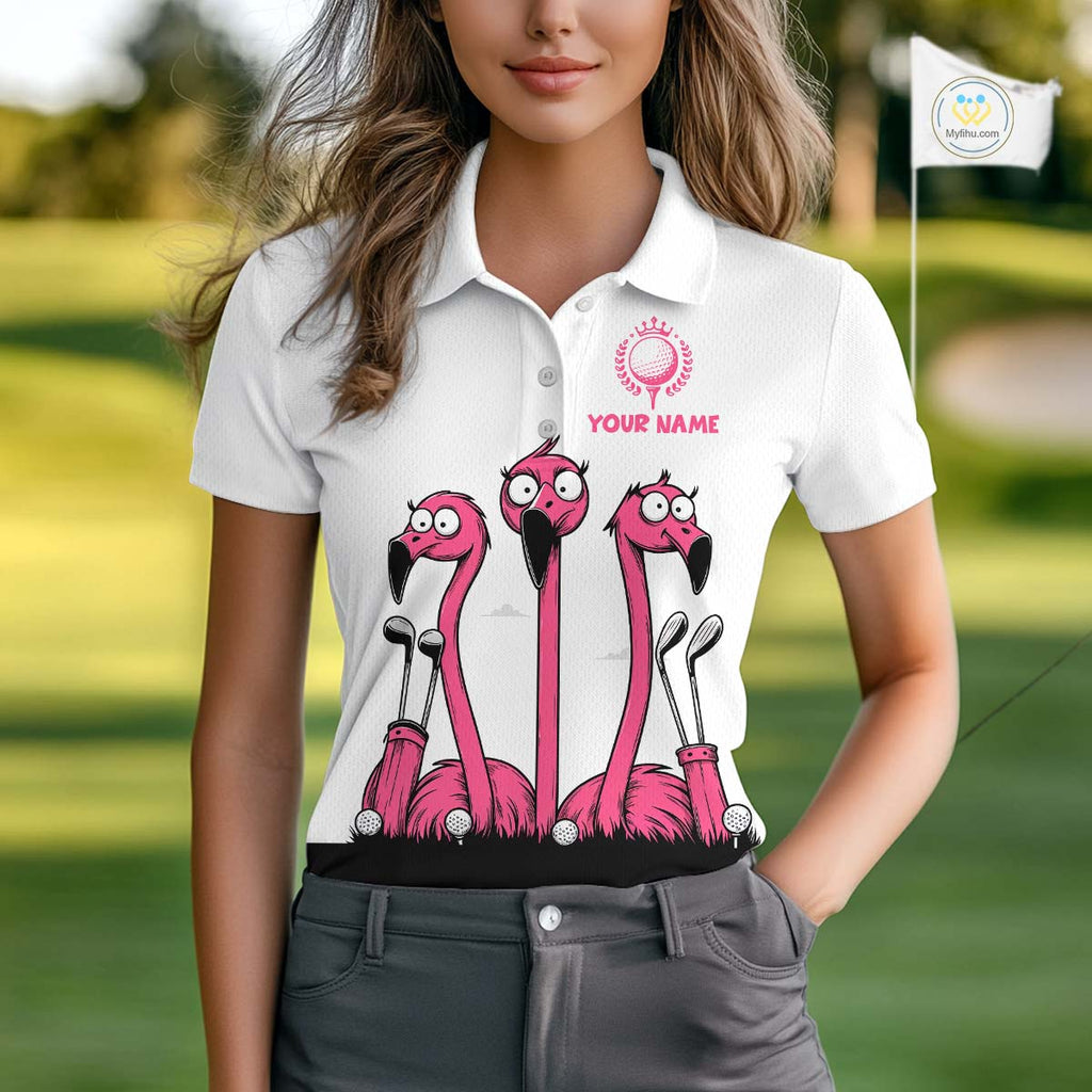 Funny pink flamingo friends white Women golf polo shirts Custom flamingo golf outfits for ladies NQS10201