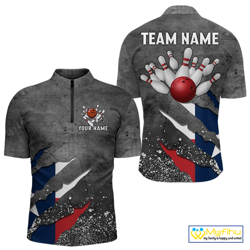 Gray Grunge Texas Flag Bowling Polo, Quarter Zip shirt for men Custom patriotic Team bowling jersey NQS10579