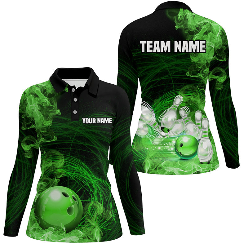 Green Flame Fire Bowling Polo, 1/4 Zip Shirt For Women Custom team bowling jersey, Gift for Bowlers NQS8663