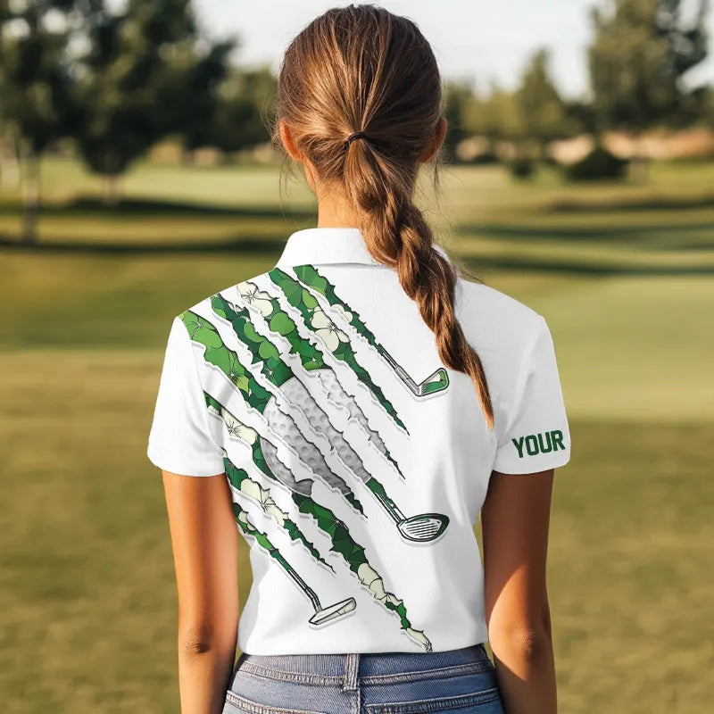 Green shamrock pattern White Women Golf Polo Shirt Custom golf clubs St Patrick day ladies golf attire NQS9476