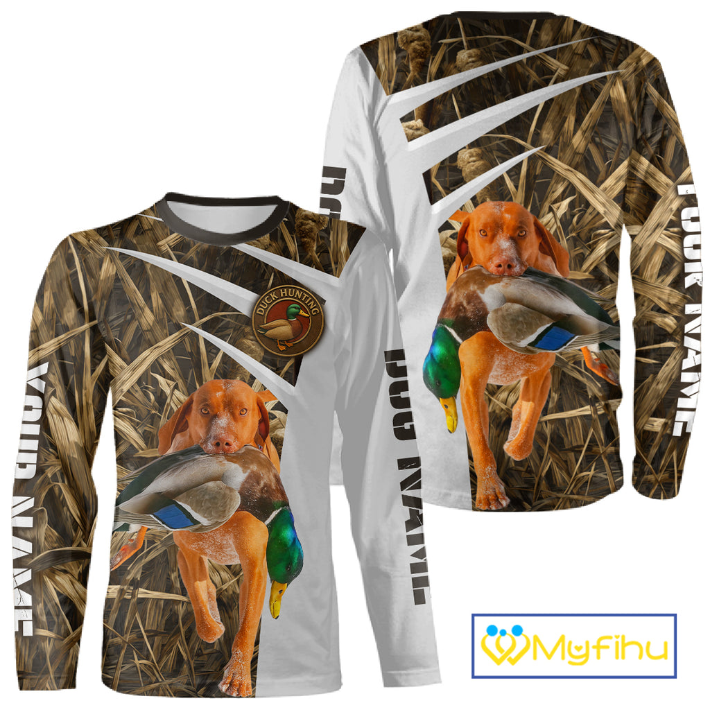 Mallard Duck Hunting Shirt Custom Name with Vizsla Dog Camo Hunting Clothes, Hunting Shirts NHT152