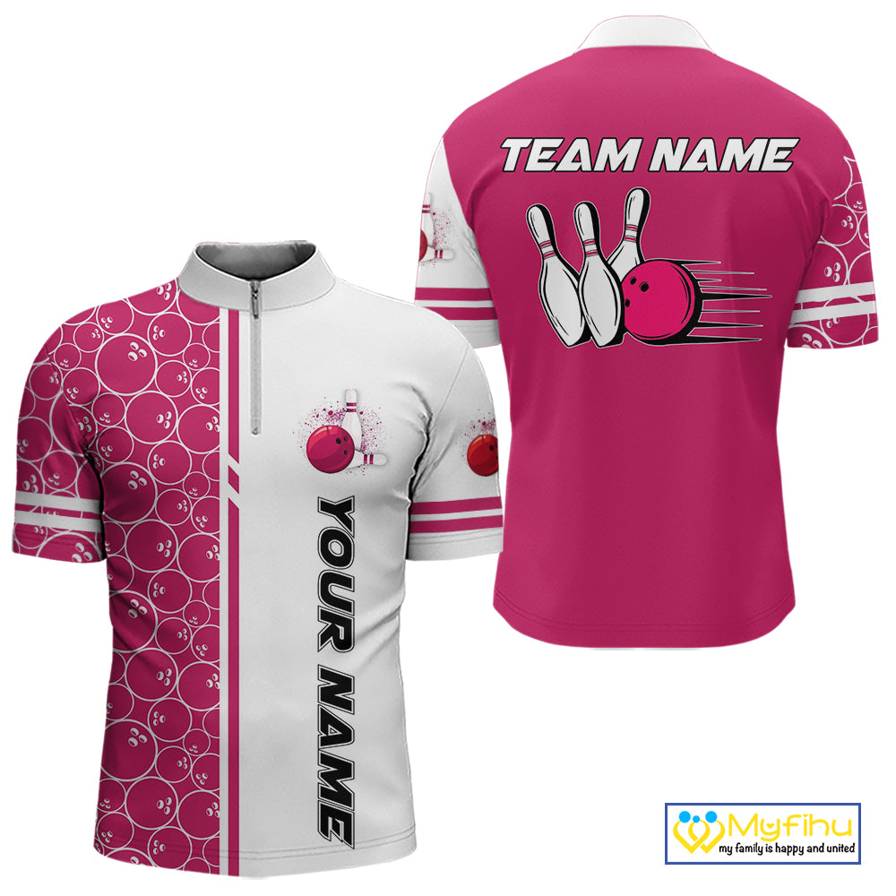 Men Bowling Polo, 1/4 Zip Shirt Custom white & pink camo vintage bowling shirts, mens bowling jersey NQS10458