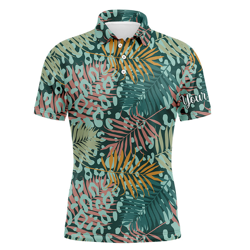 Mens golf polo upf shirts with green tropical pattern with palm leopard custom team golf polo shirts NQS4161