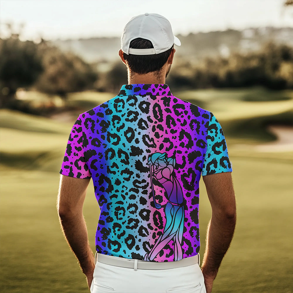 Neon Blue and purple leopard pattern Mens golf polo shirts Custom mens golf tops, unique golf gifts NQS9401