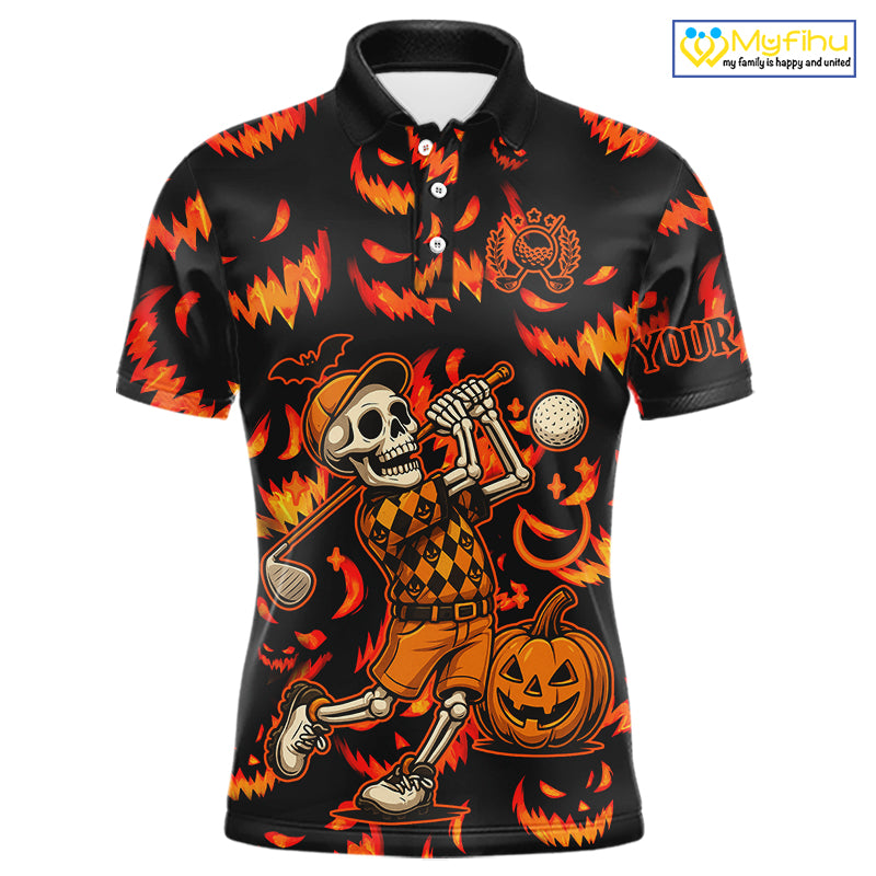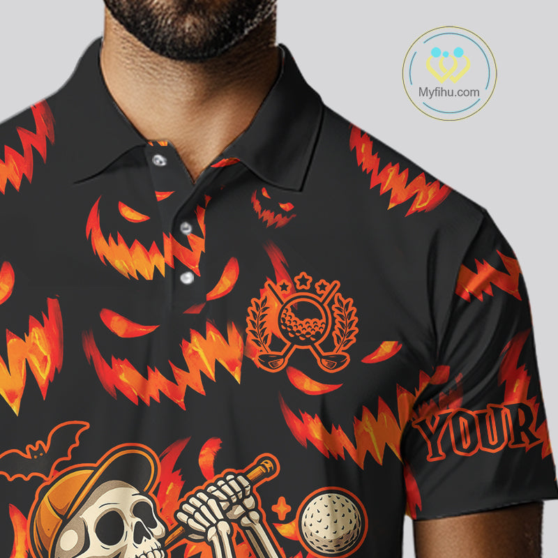 Orange and Black Halloween Pattern Funny Skull Golf polo shirt for men Custom Halloween Mens golf top NQS10352