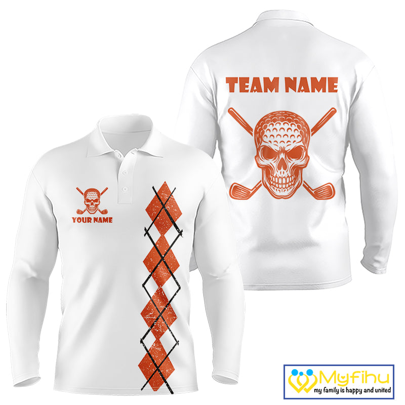 Orange argyle plaid pattern Skull White Golf polo shirts for men custom Halloween mens golf attire NQS10357