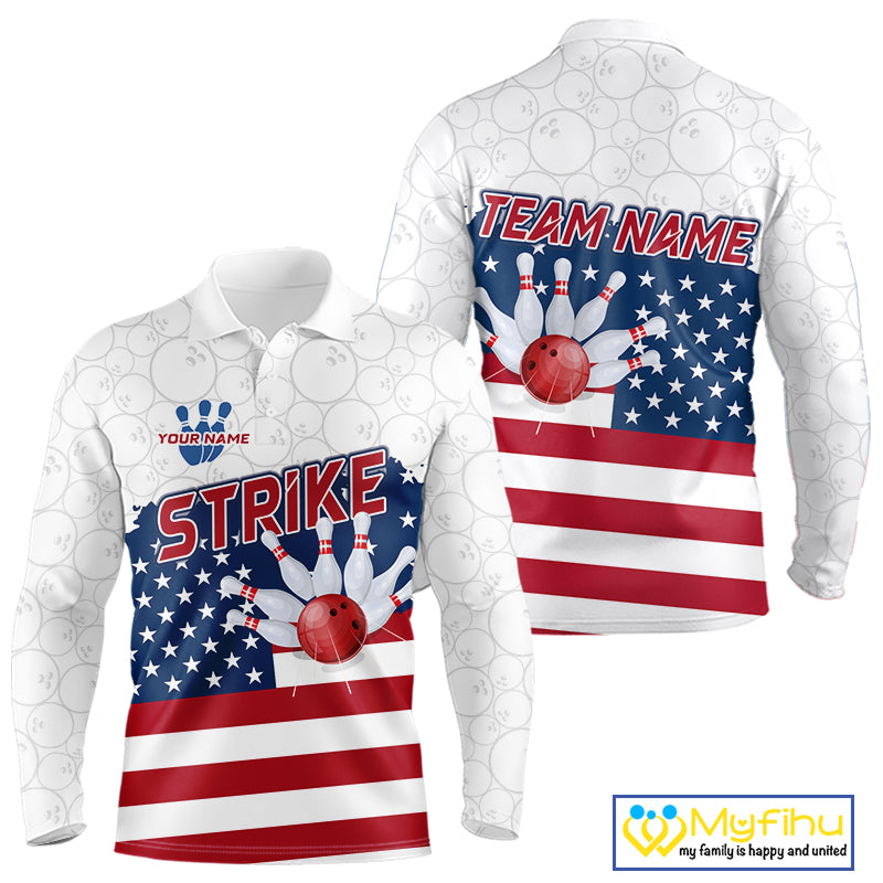 Personalized American Flag Strike Bowling Polo, 1/4 Zip Shirts For Men, Patriotic Bowling Team Jersey NQS10345