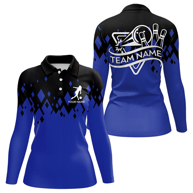 Personalized Black and Blue Bowling Polo, Quarter Zip Shirts For Women Custom Bowling Team Jerseys NQS9153