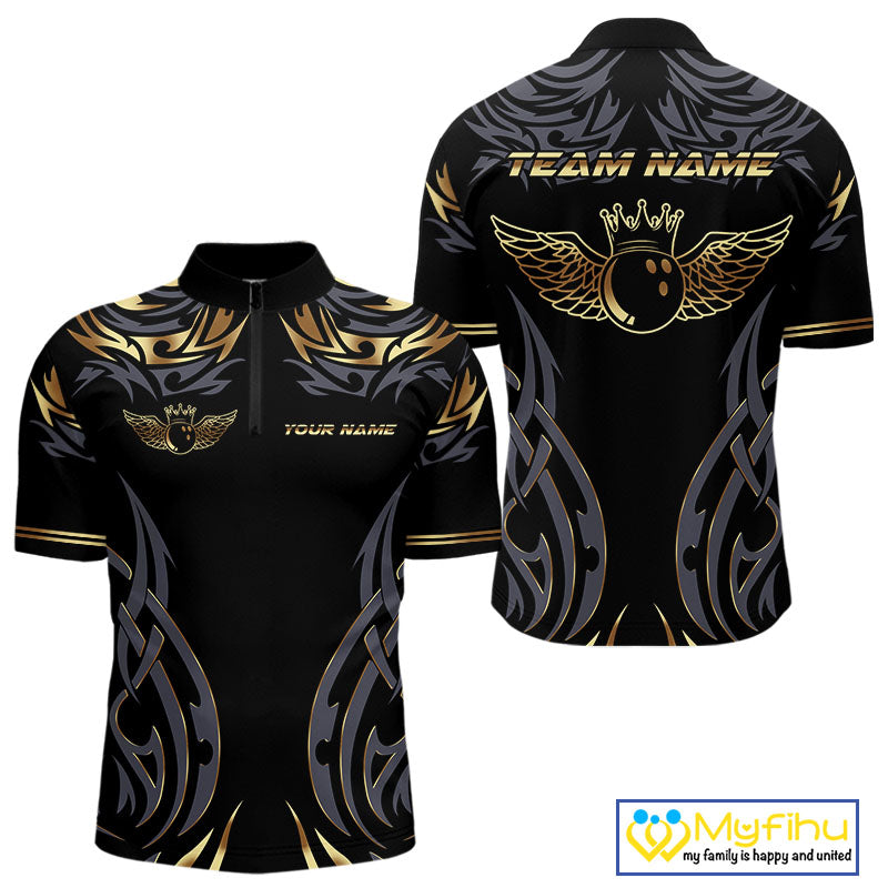 Personalized Black And Gold tribal pattern Bowling Shirts For Men, angel wings Bowling Team jerseys NQS10298