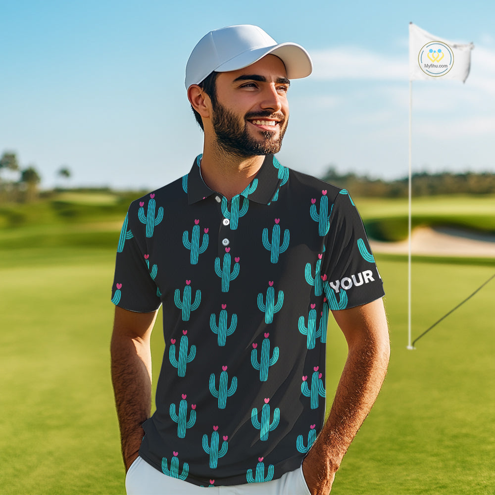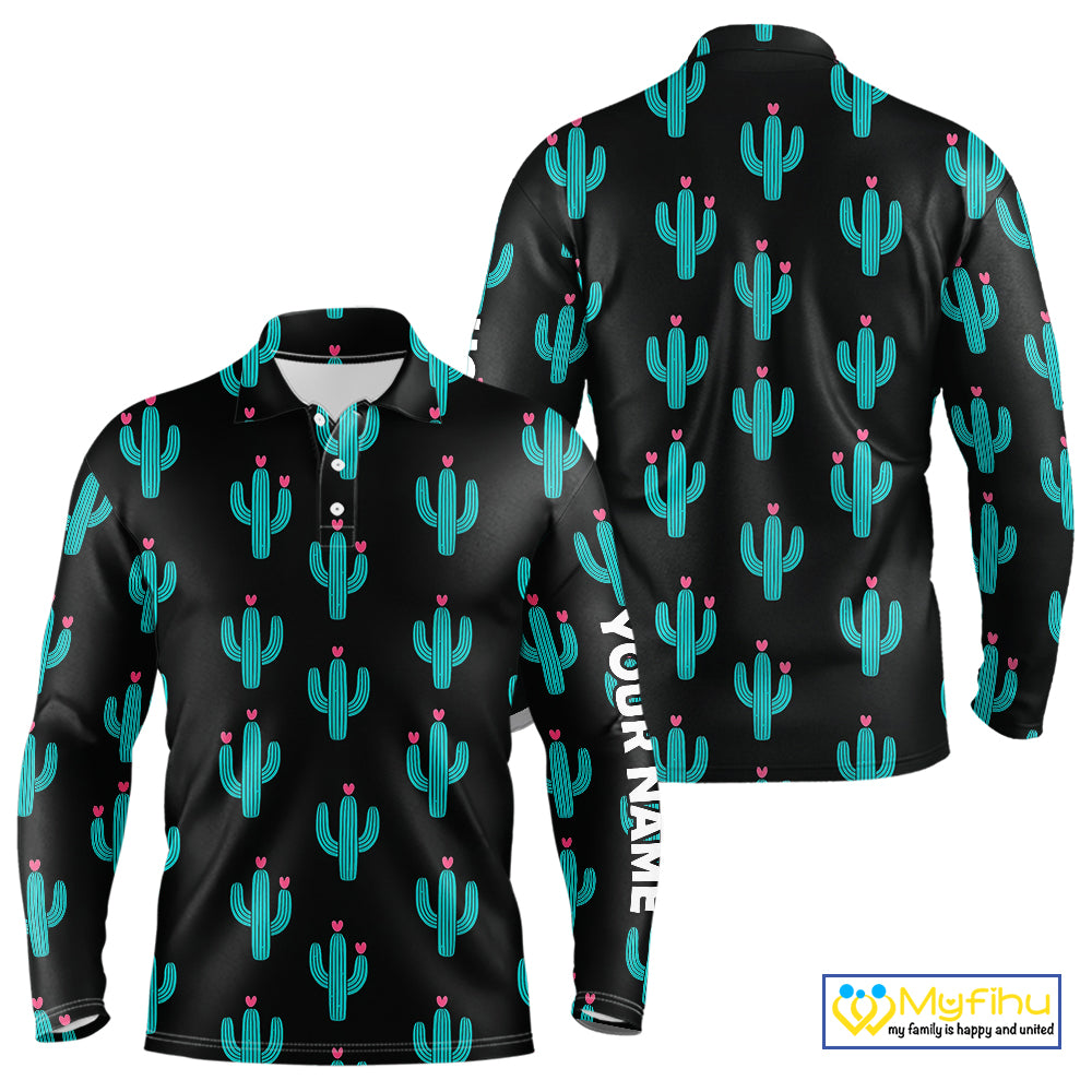 Personalized black and green cactus flower pattern mens golf polo shirts custom cactus golf shirts NQS9942