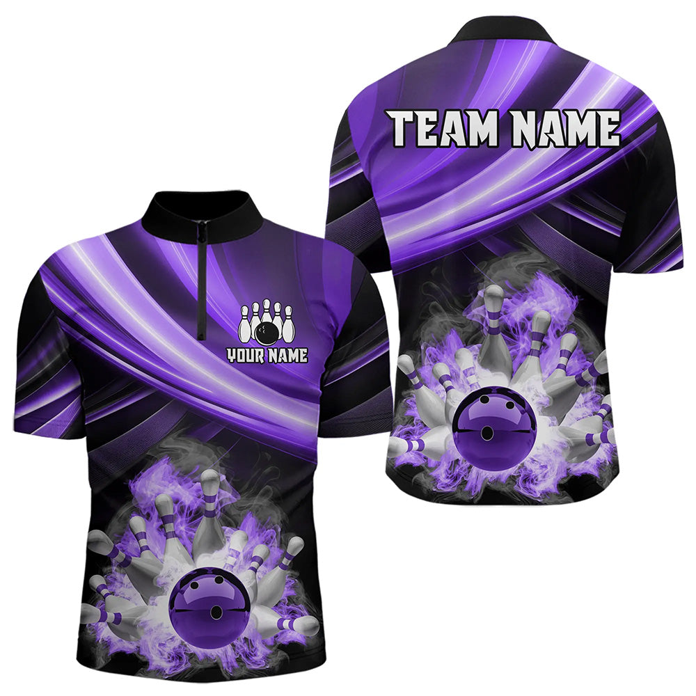 Personalized Black and Purple Smoke Flame Bowling Polo, 1/4 Zip Shirts For Men, cool bowling jerseys NQS9544