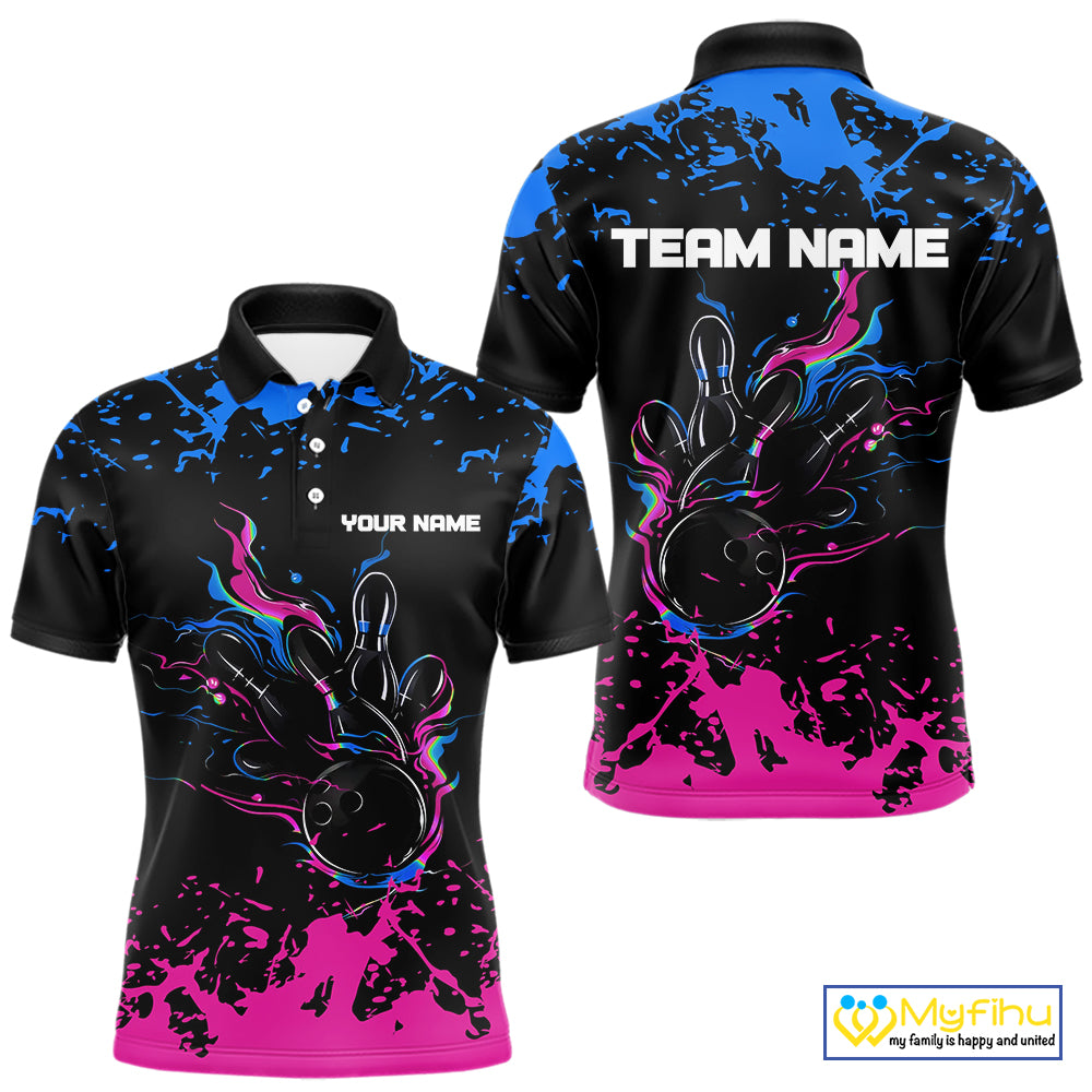 Personalized Black, Blue and Pink Bowling Shirts For Men, Bowling Balls And Pins Bowling Team Shirts NQS10742