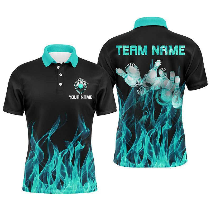 Personalized Men polo Bowling Shirt Turquoise Flame Bowling Ball Pins bowling jerseys for men Bowler NQS6822