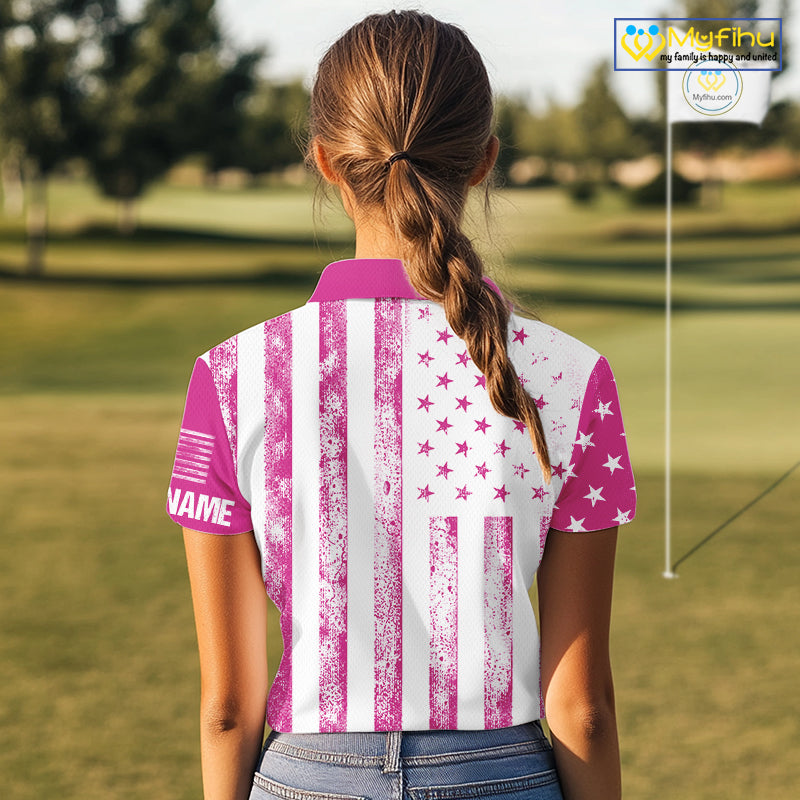 Personalized Pink & White American Flag Retro Women golf polo shirts Custom Patriotic ladies golf top NQS10307