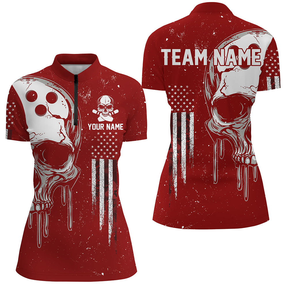 Personalized Red White grunge American Flag Skull Women Bowling Team Shirt, Patriotic Bowling Jersey NQS9227