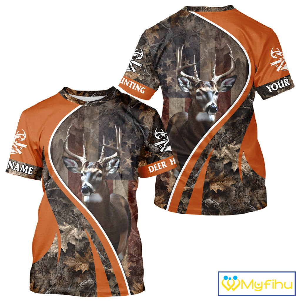 Custom Whitetail Deer Hunting Shirt 3D All Over Print with Orange Camo US Flag Hunting Gifts NBT253