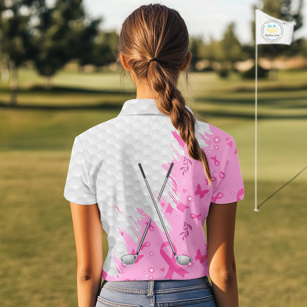 Pink ribbon breast cancer pattern custom name white Women golf polo shirts, team golf tops for ladies NQS10421