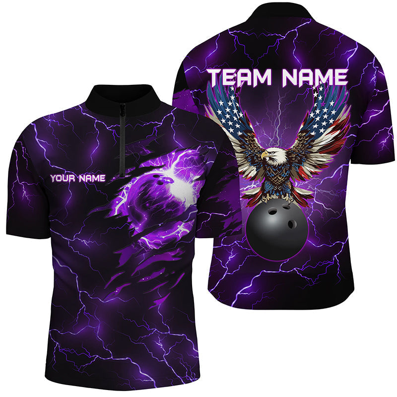 Purple lightning thunder bowling American flag Eagle custom Mens Bowling Polo, Quarter Zip Shirts NQS8862