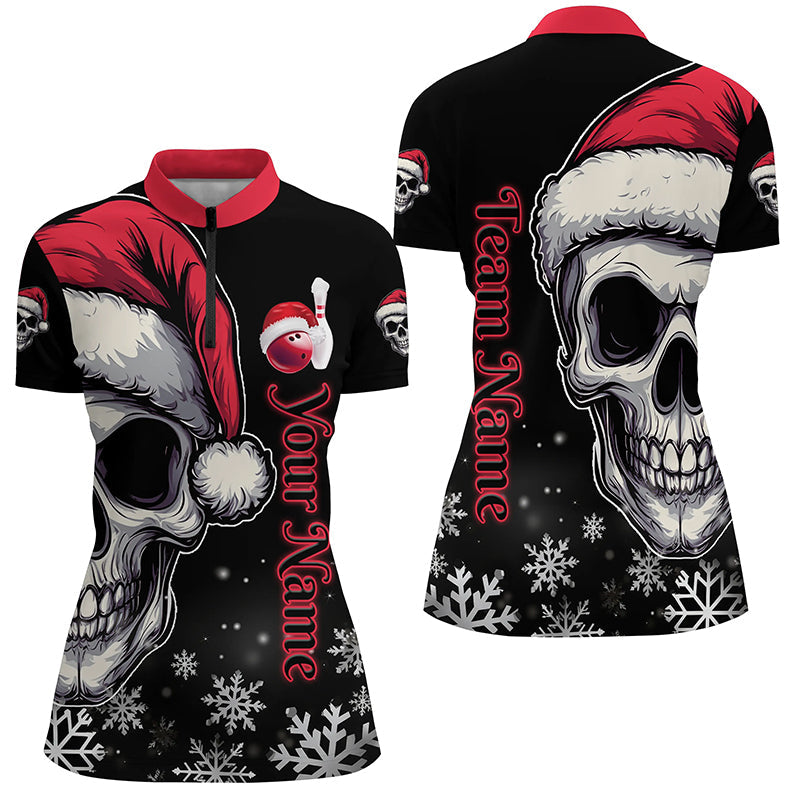Red and Black Christmas Skull Women Bowling Polo, Quarter Zip shirts custom Xmas Team bowling jerseys NQS8837