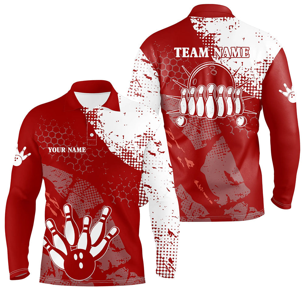 Red and white Mens polo bowling shirts Custom retro bowling ball pins bowling team league jerseys NQS6500